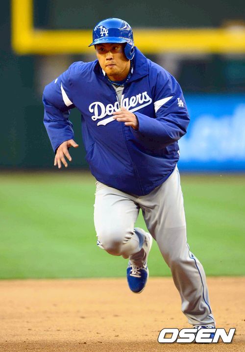 14일 오전(이하 한국시간) 미국 애리조나주 피닉스 체이스필드에서 벌어진 애리조나 다이아몬드백스와 LA 다저스의 경기 3회초 메이저리그 첫 안타를 친 류현진이 크로포드의 안타때 3루로 달리고 있다.