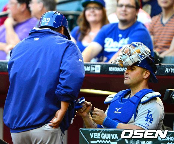 14일 오전(이하 한국시간) 미국 애리조나주 피닉스 체이스필드에서 벌어진 애리조나 다이아몬드백스와 LA 다저스의 경기 3회초 메이저리그 첫 안타를 친 류현진을 동료들이 반갑게 맞이하고 있다.