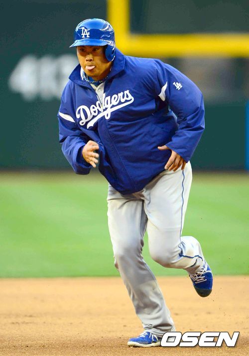 14일 오전(이하 한국시간) 미국 애리조나주 피닉스 체이스필드에서 벌어진 애리조나 다이아몬드백스와 LA 다저스의 경기 3회초 메이저리그 첫 안타를 친 류현진이 크로포드의 안타때 3루로 달리고 있다.