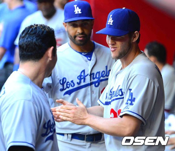 14일 오전(이하 한국시간) 미국 애리조나주 피닉스 체이스필드에서 벌어진 애리조나 다이아몬드백스와 LA 다저스의 경기 4회초 홈런을 친 곤살레스를 커쇼가 반갑게 맞이하고 있다.