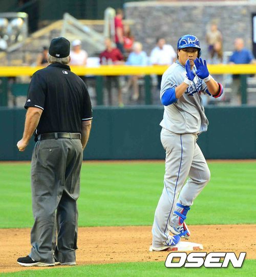 14일 오전(이하 한국시간) 미국 애리조나주 피닉스 체이스필드에서 벌어진 애리조나 다이아몬드백스와 LA 다저스의 경기 3회말 류현진이 2루타를 치고 진루하고 있다.