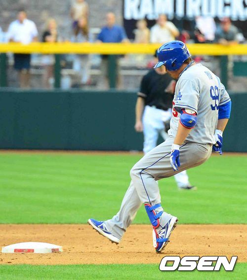 14일 오전(이하 한국시간) 미국 애리조나주 피닉스 체이스필드에서 벌어진 애리조나 다이아몬드백스와 LA 다저스의 경기 3회말 류현진이 2루타를 치고 진루하고 있다.