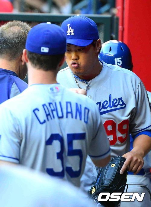 14일 오전(이하 한국시간) 미국 애리조나주 피닉스 체이스필드에서 벌어진 애리조나 다이아몬드백스와 LA 다저스의 경기 4회말 수비를 마친 류현진을 동료들이 반갑게 맞이하고 있다.