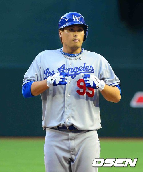 14일 오전(이하 한국시간) 미국 애리조나주 피닉스 체이스필드에서 벌어진 애리조나 다이아몬드백스와 LA 다저스의 경기 5회초 무사 류현진이 연속안타를 치고 1루에 안착 더그아웃을 바라보고 있다.