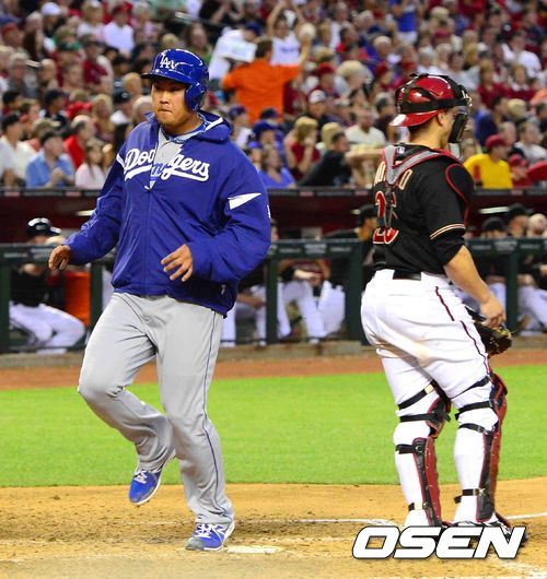 14일 오전(이하 한국시간) 미국 애리조나주 피닉스 체이스필드에서 벌어진 애리조나 다이아몬드백스와 LA 다저스의 경기 6회초 2사 3연속 안타로 진루한 류현진이 후속 타자의 안타로 홈을 밟고 있다.
