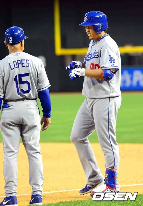 14일 오전(이하 한국시간) 미국 애리조나주 피닉스 체이스필드에서 벌어진 애리조나 다이아몬드백스와 LA 다저스의 경기 6회초 2사 3연속 안타로 진루한 류현진이 손이 아픈 듯 인상을 찡그리고 있다.