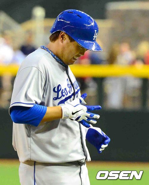 14일 오전(이하 한국시간) 미국 애리조나주 피닉스 체이스필드에서 벌어진 애리조나 다이아몬드백스와 LA 다저스의 경기 6회초 2사 3연속 안타로 진루한 류현진이 손이 아픈 듯 인상을 찡그리고 있다.