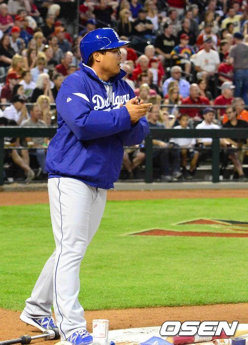 14일 오전(이하 한국시간) 미국 애리조나주 피닉스 체이스필드에서 벌어진 애리조나 다이아몬드백스와 LA 다저스의 경기 6회초 2사 3연속 안타로 진루한 류현진이 후속 타자의 안타로 득점을 올리고 박수를 치고 있다.