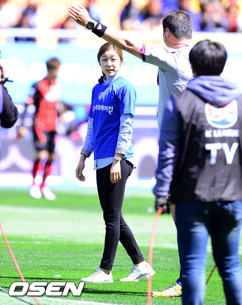 14일 오후 수원월드컵경기장에서 열린 현대오일뱅크 K리그 클래식 2013 수원 삼성과 FC서울의 경기, 경기에 앞서 김연아가 시축하고 있다