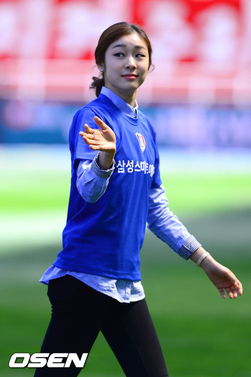14일 오후 수원월드컵경기장에서 열린 현대오일뱅크 K리그 클래식 2013 수원 삼성과 FC서울의 경기, 경기에 앞서 김연아가 시축 후 팬들에게 인사를 하고 있다