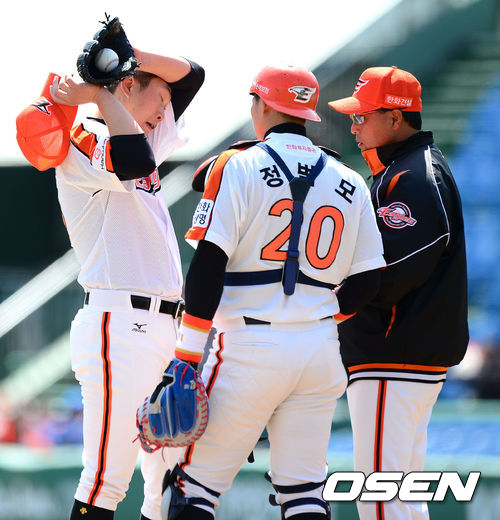 1회초 1사 2,3루에서 한화 송진우 코치가 마운드에 올라 김혁민과 이야기를 나누고 있다.