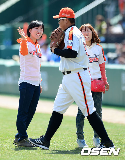 경기에 앞서 한화 김태균이 여성 회원들과 하이파이브를 하며 그라운드에 들어서고 있다.