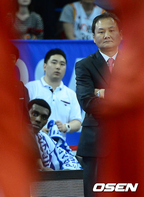 2쿼터, 모비스 유재학 감독이 코트를 바라보고 있다.