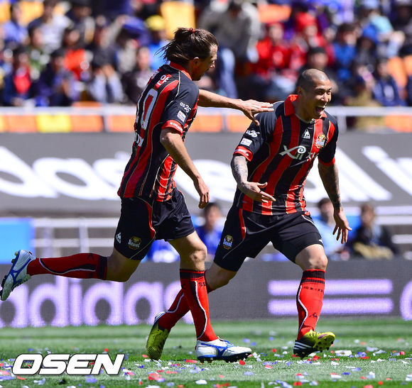 14일 오후 수원월드컵경기장에서 열린 현대오일뱅크 K리그 클래식 2013 수원 삼성과 FC서울의 경기, 전반 FC서울 데얀이 선취골을 넣고 환호하고 있다