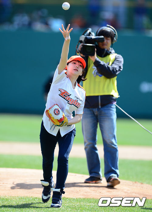 경기에 앞서 배우 곽지민이 시구를 하고 있다.