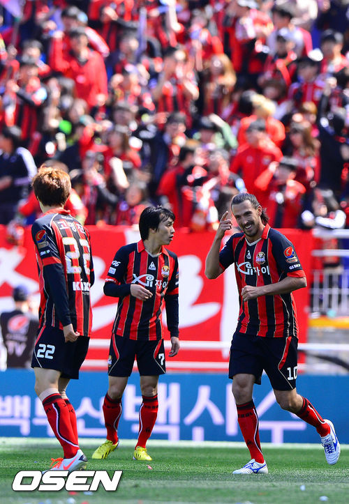 14일 오후 수원월드컵경기장에서 열린 현대오일뱅크 K리그 클래식 2013 수원 삼성과 FC서울의 경기, 전반 FC서울 데얀이 선취골을 넣고 환호하고 있다