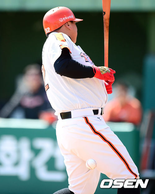 2회말 무사에서 한화 김태균이 LG 우규민의 투구에 허벅지를 맞고 있다.