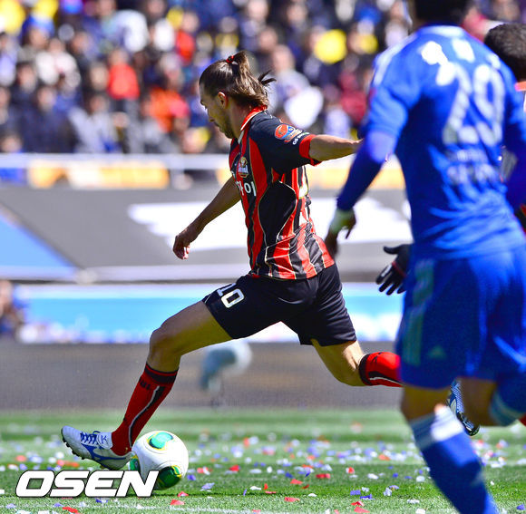 14일 오후 수원월드컵경기장에서 열린 현대오일뱅크 K리그 클래식 2013 수원 삼성과 FC서울의 경기, 전반 FC서울 데얀이 선취골을 넣고 있다