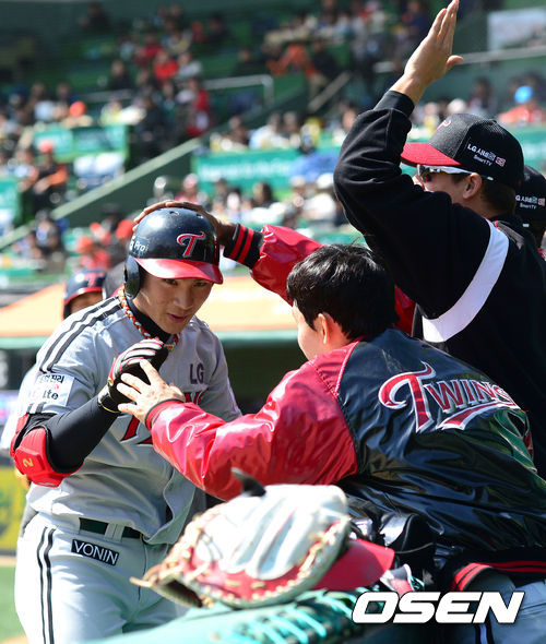 3회초 무사에서 LG 오지환이 좌월 솔로포를 날리고 더그아웃에서 동료선수들의 축하를 받고 있다. 오지환은 3경기 연속 홈런.