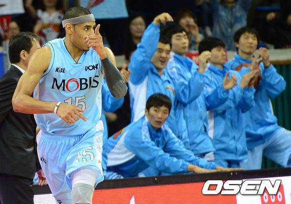 3쿼터, 모비스 문태영이 골을 성공시킨 뒤 기뻐하고 있다.