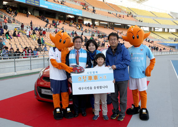 대구FC는 지난해부터 대구지역 대표 기업 및 인사들의 후원릴레이로 진행된 '힘내라 대구! 으랏車車 응원릴레이'가 '으랏車車 + α'로 새롭게 진행하고 있다. '으랏車車 + α'는 기아자동차 '모닝' 경품 뿐만 아니라 홈경기 득점시 1골당 100만원을 적립해 총 5명에게 추첨을 통해 '전통시장 상품권 20만원권'을 제공한다.