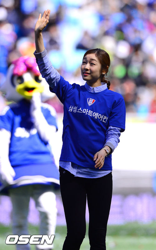 14일 오후 수원월드컵경기장에서 열린 현대오일뱅크 K리그 클래식 2013 수원 삼성과 FC서울의 경기 , 하프타임때 피겨선수 김연아가 수원 팬들에게 인사를 하고 있다