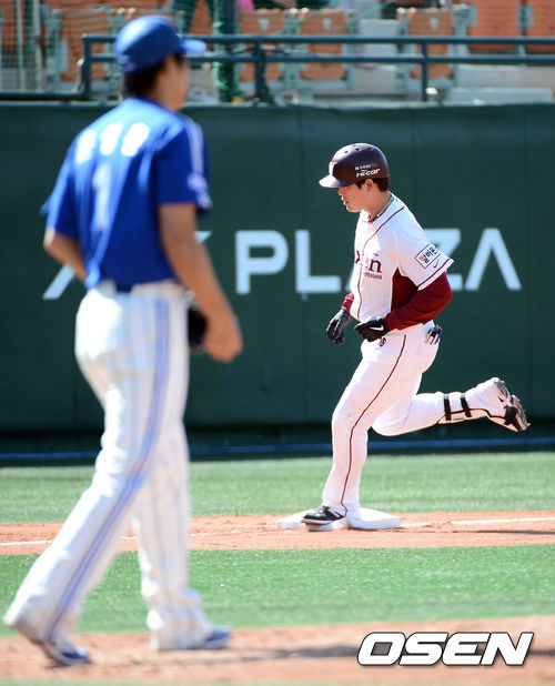 14일 오후 서울 목동구장에서 열린 '2013 한국야쿠르트 세븐 프로야구' 넥센 히어로즈와 삼성 라이온즈의 경기 4회말 무사 넥센 이성열이 우측담장을 넘기는 솔로홈런을 때린 뒤 베이스를 돌고 있다.