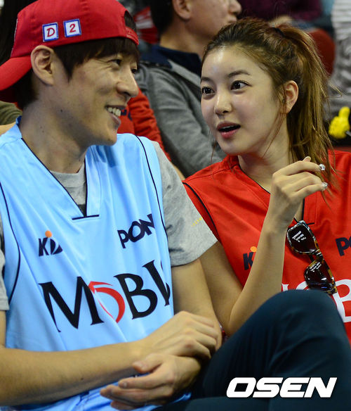 서지석과 ns윤지가 경기장을 찾아 모비스를 응원하고 있다.