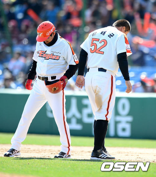 4회말 1사 1루에서 한화 김태균이 최진행의 내야땅볼로 2루 포스아웃으로 물러나며 아쉬워하고 있다. 최진행은 병살타.