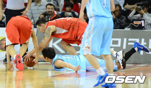 4쿼터, 모비스 함지훈과 SK 김민수, 김선형이 루즈볼 다툼을 벌이고 있다.