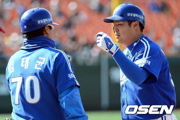 14일 오후 서울 목동구장에서 열린 '2013 한국야쿠르트 세븐 프로야구' 넥센 히어로즈와 삼성 라이온즈의 경기 5회초 1사 만루 삼성 박한이가 2타점 적시타를 때린 뒤 김태균 코치와 기뻐하고 있다.