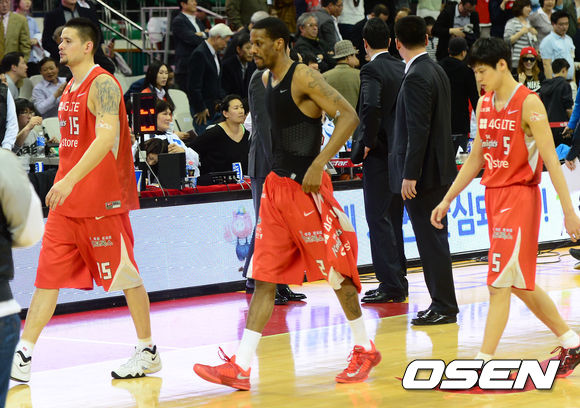 경기 종료 직후 SK 김민수, 헤인즈, 김선형이 아쉬운 표정으로 코트를 나서고 있다.