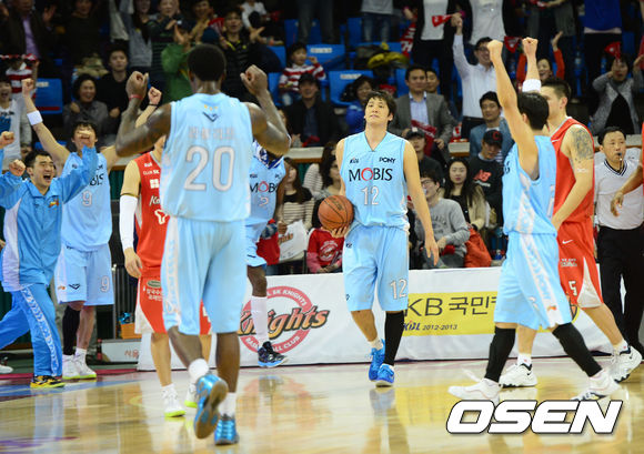 경기 종료 직후 모비스 선수들이 환호하고 있다.