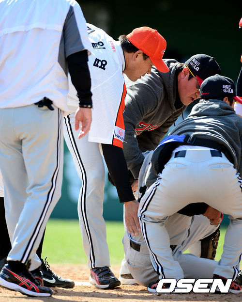 5회초 1사 1,2루에서 LG 현재윤이 한화 김일엽의 투구에 맞아 쓰러지자 김일엽이 미안함을 표시하고 있다.