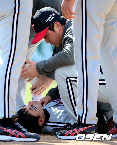 5회초 1사 1,2루에서 LG 현재윤이 한화 김일엽의 투구에 맞아 쓰러지고 트레이너가 상태를 점검하고 있다. 현재윤은 교체.
