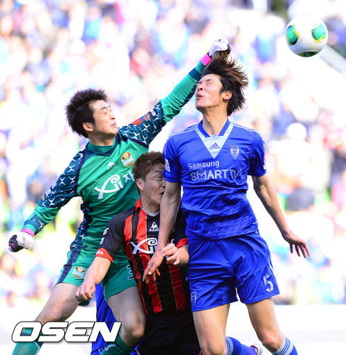 후반 FC서울 유상훈 골키퍼와 수원 박현범이 공중볼을 다투고 있다. / soul1014@osen.co.kr