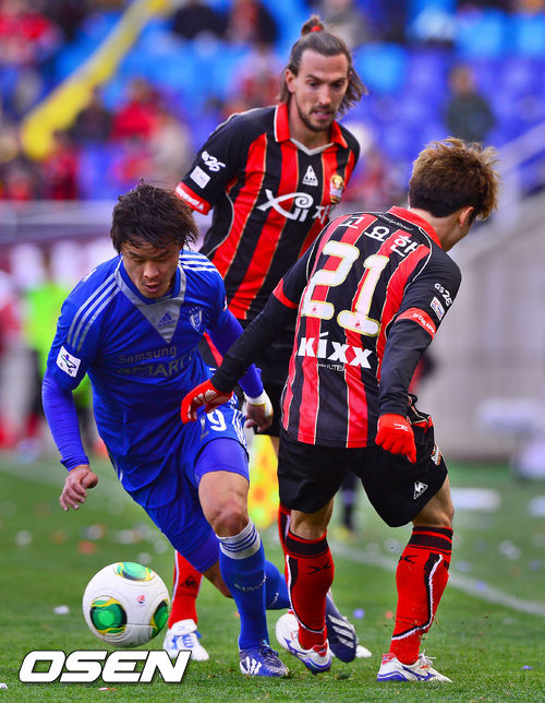 후반 수원 곽희주가 FC서울 고요한과 데얀의 수비를 제치며 드리블하고 있다. / soul1014@osen.co.kr