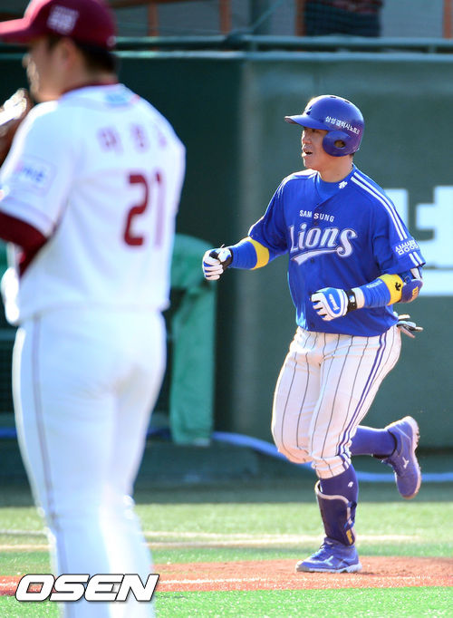 14일 오후 서울 목동구장에서 열린 '2013 한국야쿠르트 세븐 프로야구' 넥센 히어로즈와 삼성 라이온즈의 경기 8회초 무사 1,2루 삼성 조동찬이 3점 홈런을 때린 뒤 베이스를 돌고 있다.