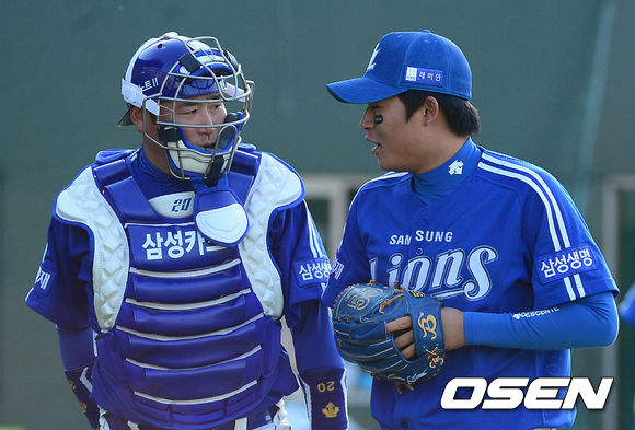 14일 오후 서울 목동구장에서 열린 '2013 한국야쿠르트 세븐 프로야구' 넥센 히어로즈와 삼성 라이온즈의 경기 8회말 삼성 심창민과 진갑용이 이닝을 마무리하고 더그아웃으로 들어오면서 이야기를 나누고 있다.