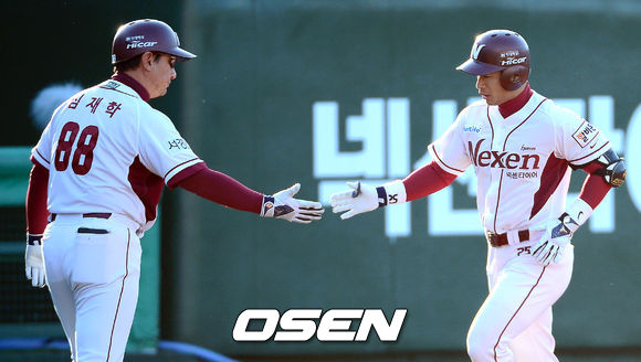 9회말 2사 넥센 송지만이 솔로홈런을 때린 뒤 심재학 코치와 하이파이브를 하고 있다. / youngrae@osen.co.kr