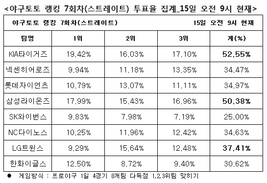 국민체육진흥공단(www.kspo.or.kr)이 발행하는 체육진흥투표권 수탁사업자인 스포츠토토 공식발매사이트인 베트맨(www.betman.co.kr)은 오는 16일에 개최되는 삼성-SK, 한화-NC, KIA-LG, 롯데-넥센 등 4경기 8개팀을 대상으로 한 야구토토 랭킹 7회차 스트레이트 게임 중간집계결과 KIA(52.55%), 삼성(50.38%), LG(37.41%)를 차례로 다득점 상위 3개팀으로 꼽았다고 밝혔다. 반면 SK(25.00%)와 한화(30.62%)는 가장 적은 득점을 기록할 것으로 예상했다.