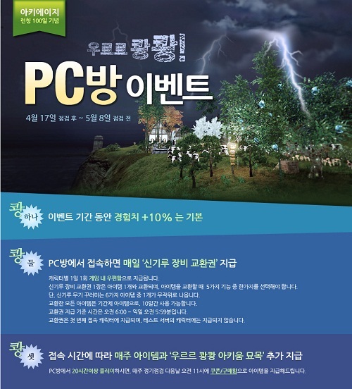 또한 3주 동안 가맹 PC방에서 주당 20시간 이상 플레이한 유저는 신규 탈것 등 특별 아이템을 매주 받을 수 있다. 세 가지 아이템을 모두 획득한 유저에게는 ‘우르르쾅쾅 아키움 묘목 꾸러미’를 추가 증정한다.