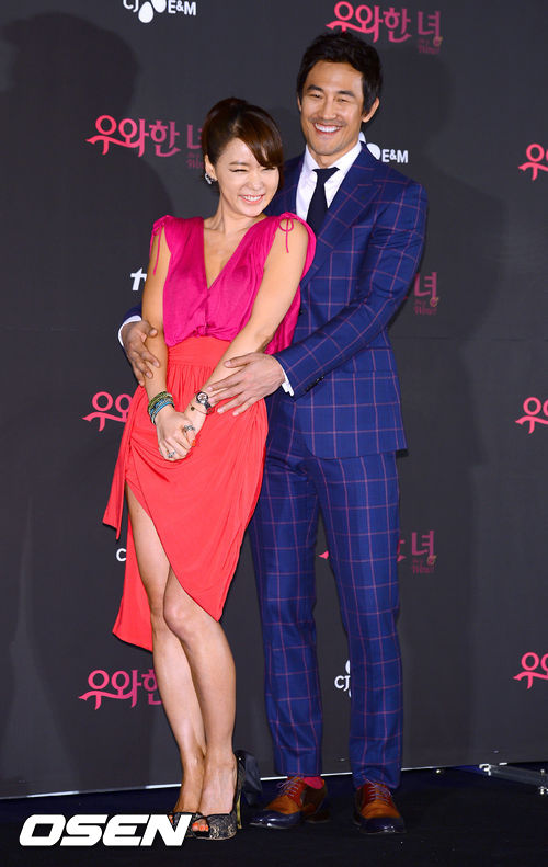 15일 오후 서울 상암동 CJ E&M에서 진행된 tvN 새 드라마 '우와한 녀' 제작발표회에서 한정수와 안선영이 포즈를 취하고 있다