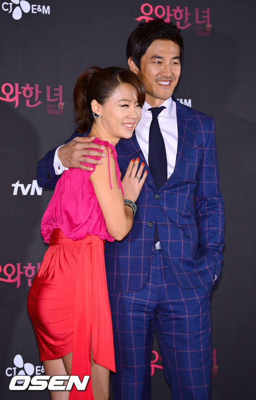 15일 오후 서울 상암동 CJ E&M에서 진행된 tvN 새 드라마 '우와한 녀' 제작발표회에서 안선영과 한정수가 포즈를 취하고 있다