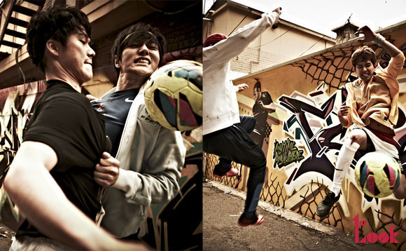 도심 속 거친 콘크리트 위 어디선가 우연히 만나 3대3 축구 시합을 펼치게 된다는 이번 화보 스토리의 주인공으로는 아이돌 그룹 ‘인피니트’의 우현과 호야, 엘, 그리고 아시아축구연맹(AFC) 19세 이하(U-19) 챔피언십 우승 멤버인 김승준, 오영준, 강상우가 만났다.