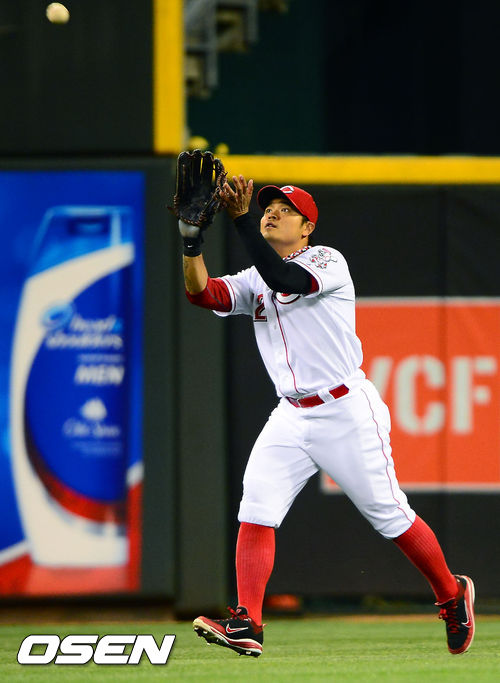 8회초 1사 주자 2루 필라델피아 클라츠의 타구를 신시내티 중견수 추신수가 잡아내고 있다. / rumi@osen.co.kr