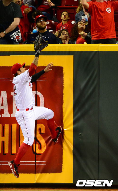 8회초 2사 주자 2루 필라델피아 어틀리의 중월 투런 홈런 타구를 신시내티 중견수 추신수가 잡아내려하고 있다. / rumi@osen.co.kr