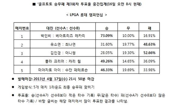 LPGA 롯데 챔피언십 대상 골프토토 승무패 3회차 투표율 중간집계 결과