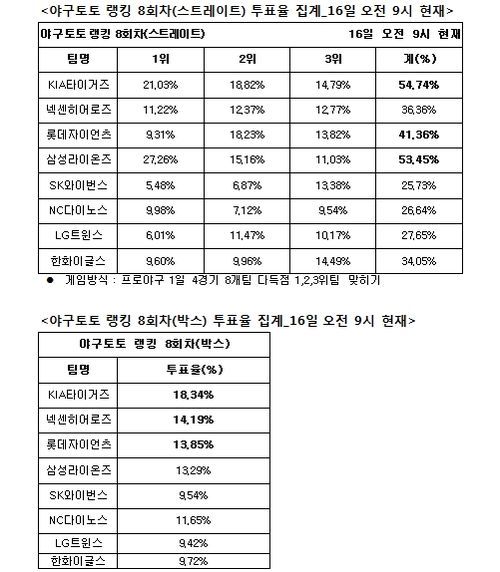 국민체육진흥공단(www.kspo.or.kr)이 발행하는 체육진흥투표권 수탁사업자인 스포츠토토 공식발매사이트인 베트맨(www.betman.co.kr)은 17일(수)에 개최되는 삼성-SK, 한화-NC, KIA-LG, 롯데-넥센 등 4경기 8개팀을 대상으로 한 야구토토 랭킹 8회차 스트레이트 게임 중간집계결과 KIA(54.74%), 삼성(53.45%), 롯데(41.36%)을 차례로 다득점 상위 3개팀으로 꼽았다고 밝혔다. 반면 NC와 SK는 각각 26.64%와 25.73%를 득표해 가장 적은 득점을 기록할 것으로 예상했다.