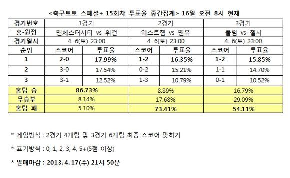 잉글랜드 프리미어리그 3경기 대상 축구토토 스페셜+ 15회차 투표율 중간집계 결과